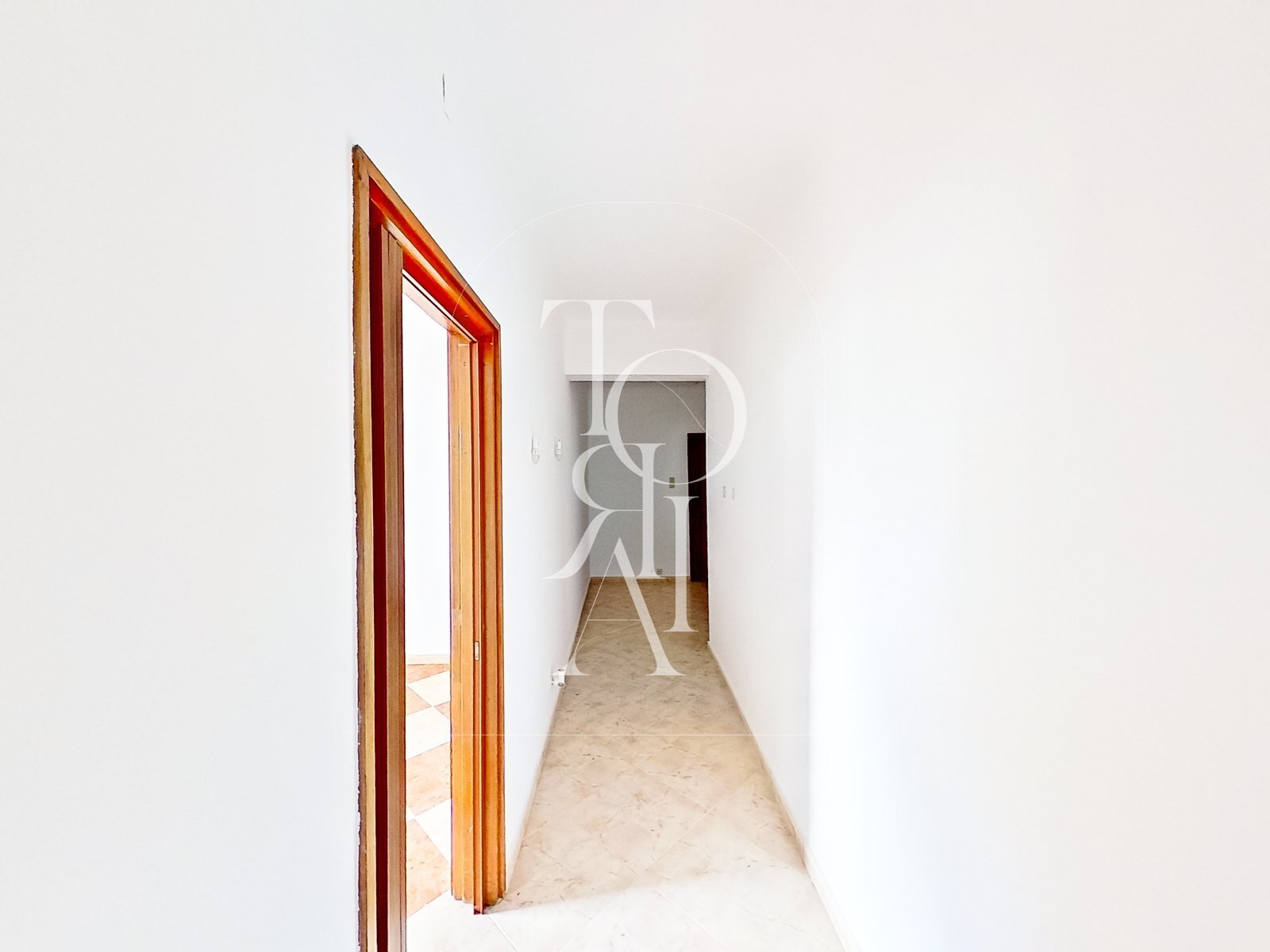 O imóvel, originalmente um T3, foi transformado em T2, criando uma ampla sala de estar e de refeições através da junção de dois quartos.